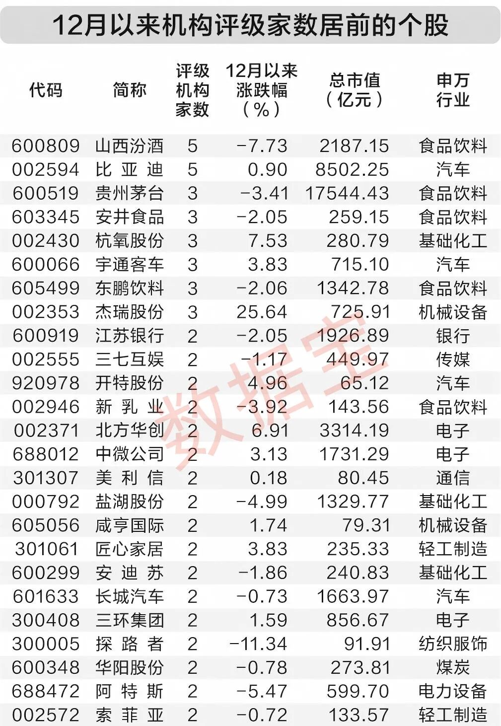 從個股來看,本月以來共有8股獲得3家及以上機構評級,其中比亞迪(002594)、山西汾酒(600809)機構評級家數居前,各有5家,貴州茅臺(600519)、安井食品(603345)、杭氧股份(002430)等6股機構評級家數為3家。