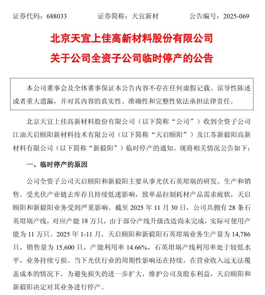 12月12日,天宜新材發(fā)布公告,公司全資子公司江油天啟頤陽新材料技術有限公司和江蘇新毅陽高新材料有限公司因光伏產(chǎn)業(yè)鏈去庫存及持續(xù)低迷,決定臨時停產(chǎn)。