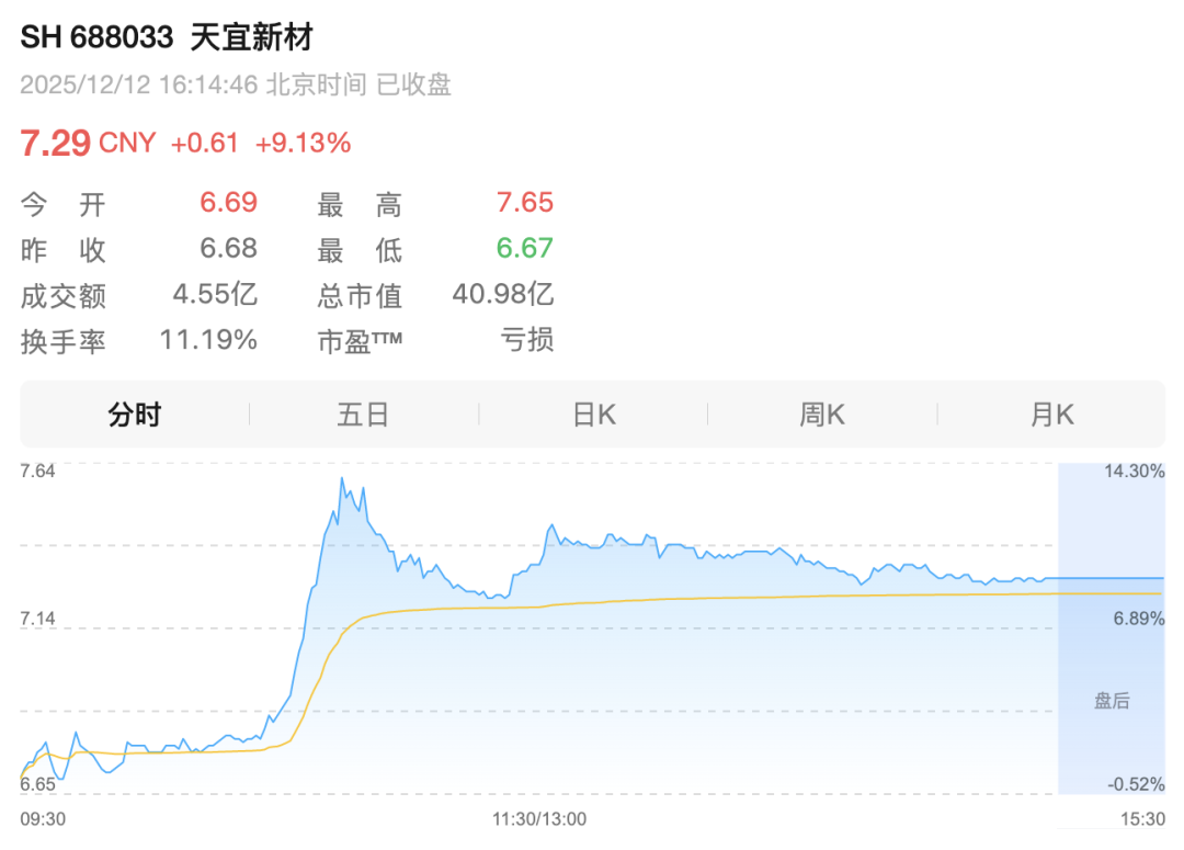 截至今日收盤,天宜新材報7.29元/股,漲9.13%,總市值40.98億元。
