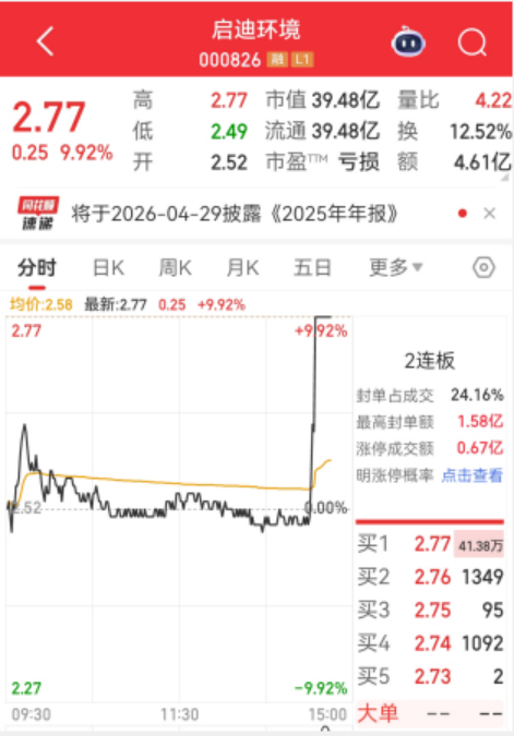 2月26日午后約14:30,環(huán)保股啟迪環(huán)境(000826)突然大幅上漲,5分鐘內(nèi)由綠盤拉升至漲停板。該股此前1個(gè)交易日錄得漲停板,最新股價(jià)達(dá)到2.77元/股,創(chuàng)近1年來新高。
