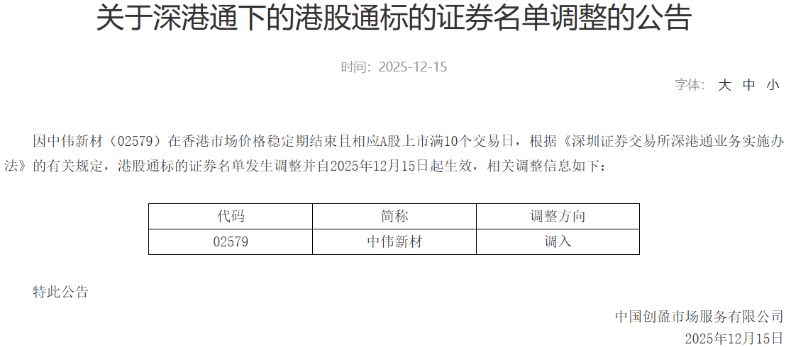 深交所公告,因中偉新材(02579)在香港市場價格穩(wěn)定期結束且相應A股上市滿10個交易日,根據(jù)《深圳證券交易所深港通業(yè)務實施辦法》的有關規(guī)定,港股通標的證券名單發(fā)生調整并自2025年12月15日起生效,調入中偉新材。