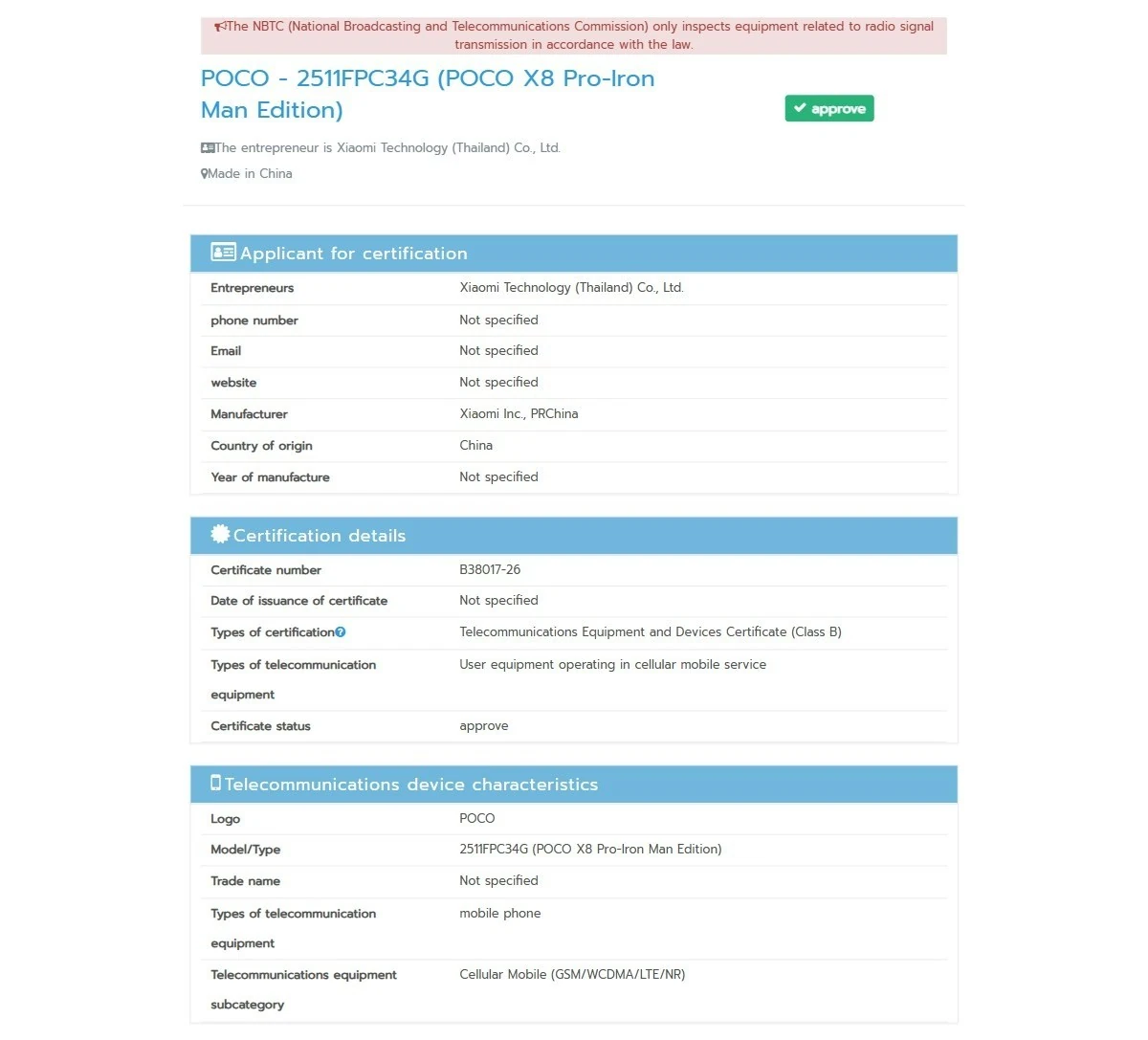 如今,一款型號(hào)為2511FPC34G的小米POCO新機(jī)現(xiàn)身泰國NBTC(IT之家注:國家廣播及電信局委員會(huì))認(rèn)證數(shù)據(jù)庫,這款手機(jī)預(yù)計(jì)將是X8Pro的鋼鐵俠限定版,有望近期亮相。