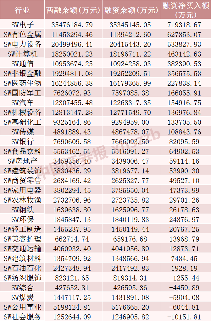 從行業(yè)情況來看,上周申萬一級31個行業(yè)中有26個行業(yè)融資余額增加,電子、有色金屬、電力設(shè)備行業(yè)融資凈買入金額居前,分別為71.93億元、62.74億元、53.38億元。在出現(xiàn)融資余額減少的5個行業(yè)中,社會服務(wù)、公用事業(yè)、煤炭行業(yè)融資凈賣出金額居前,分別為凈賣出1.02億元、0.60億元、0.59億元。