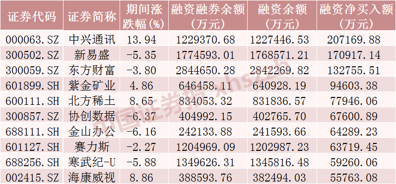從個股情況來看,上周融資客對138只股票加倉金額超1億元,加倉居前的10只股票分別為中興通訊、新易盛(300502)、東方財富(300059)、紫金礦業(yè)(601899)、北方稀土(600111)、協(xié)創(chuàng)數(shù)據(jù)、金山辦公、賽力斯(601127)、寒武紀(jì)-U、?低(002415),分別凈買入20.72億元、17.09億元、13.28億元、9.46億元、7.79億元、6.76億元、6.43億元、6.37億元、5.93億元、5.58億元。從市場表現(xiàn)上看,上周融資客加倉居前十的股票跌多漲少,漲幅最大的中興通訊漲逾13%。