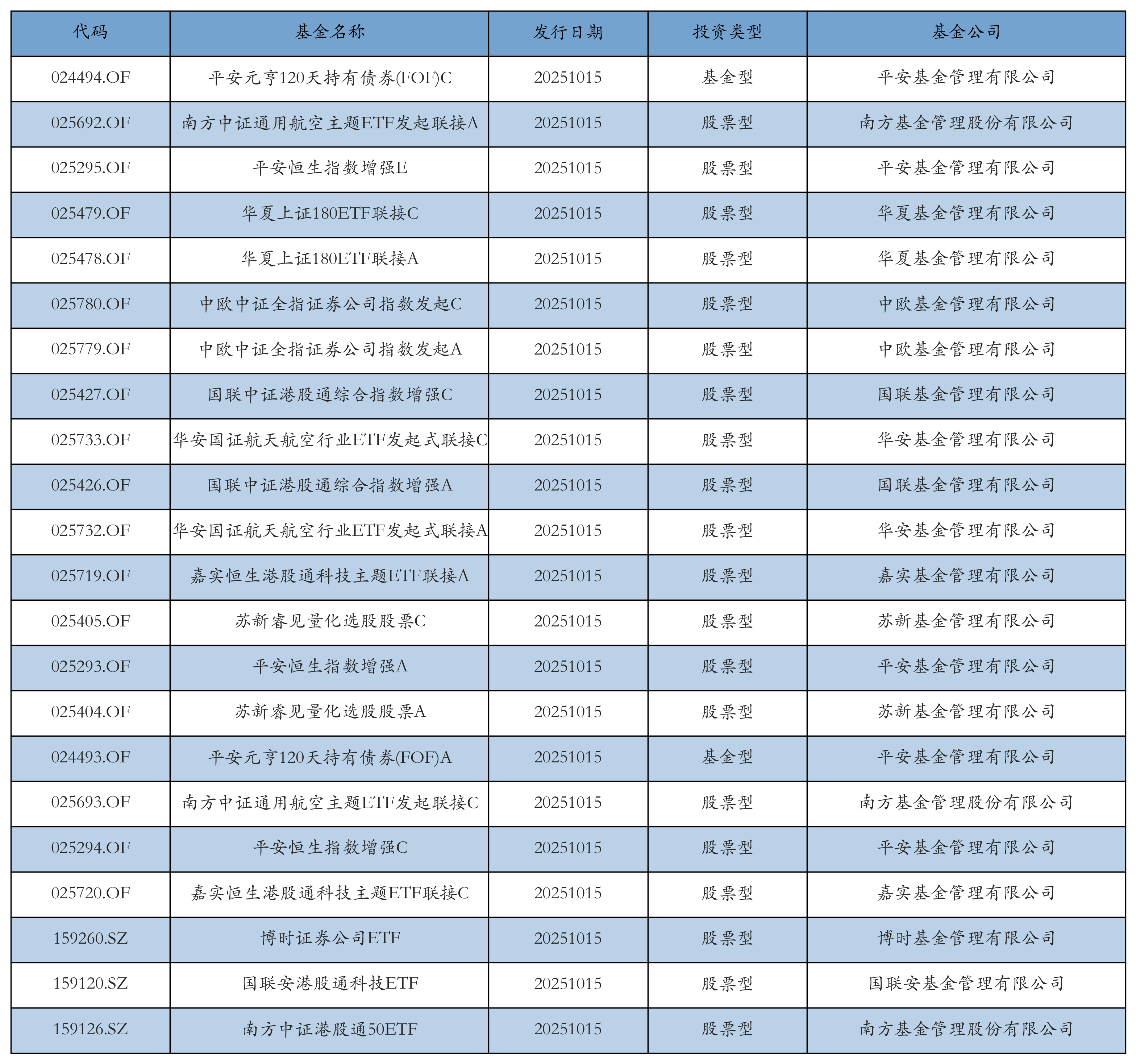 昨日有22只新基金發(fā)行,分別為:平安元亨120天持有債券(FOF)C、南方中證通用航空主題ETF發(fā)起聯接A、平安恒生指數增強E、華夏上證180ETF聯接C、華夏上證180ETF聯接A、中歐中證全指證券公司指數發(fā)起C、中歐中證全指證券公司指數發(fā)起A、國聯中證港股通綜合指數增強C、華安國證航天航空行業(yè)ETF發(fā)起式聯接C、國聯中證港股通綜合指數增強A、華安國證航天航空行業(yè)ETF發(fā)起式聯接A、嘉實恒生港股通科技主題ETF聯接A、蘇新睿見量化選股股票C、平安恒生指數增強A、蘇新睿見量化選股股票A、平安元亨120天持有債券(FOF)A、南方中證通用航空主題ETF發(fā)起聯接C、平安恒生指數增強C、嘉實恒生港股通科技主題ETF聯接C、博時證券公司ETF、國聯安港股通科技ETF、南方中證港股通50ETF,詳情見下表: